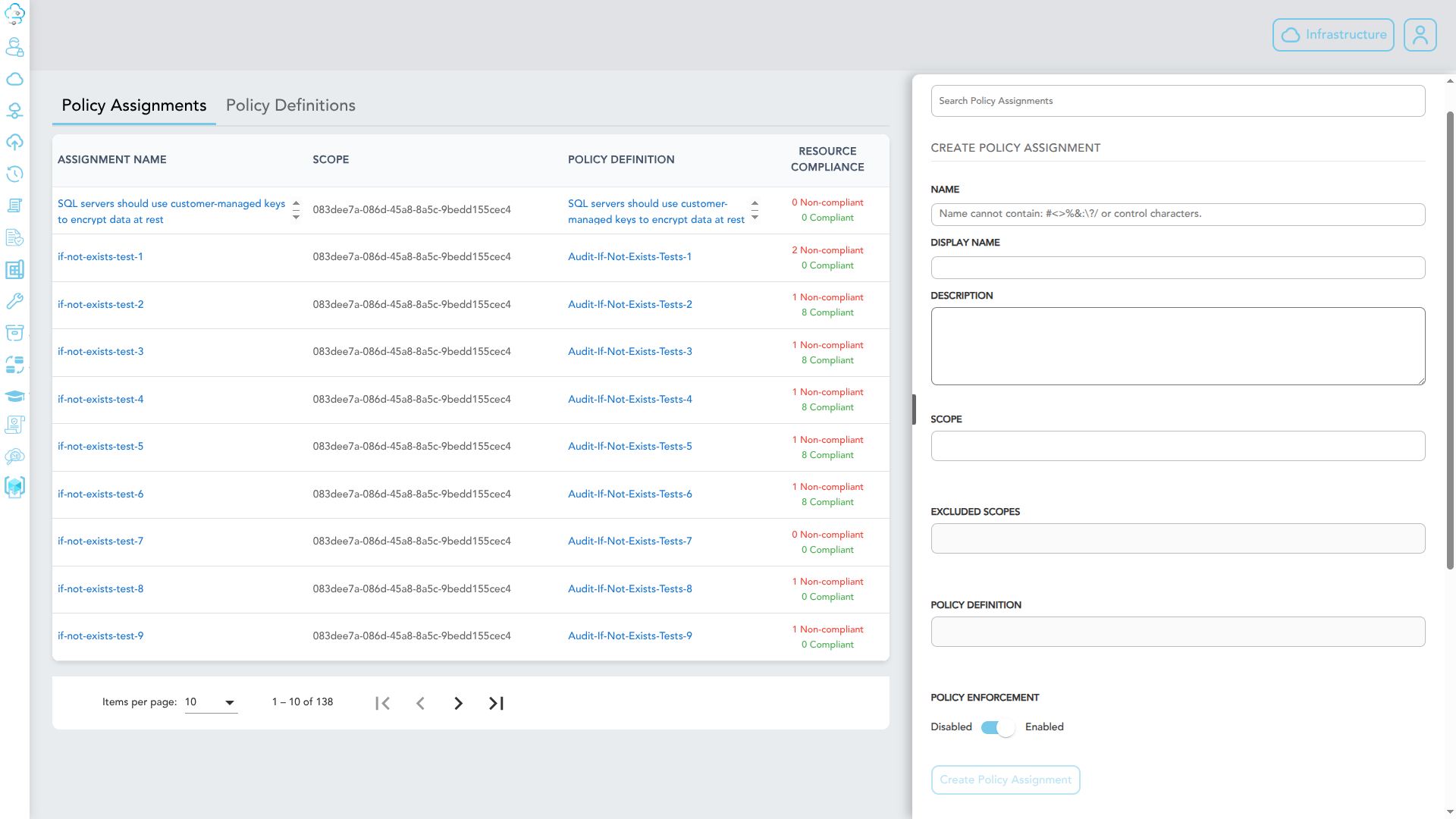 Generate Azure policies automatically with intelligent rule builders — no JSON authoring required. Inspect existing policies across your entire tenant, identify which resources are triggering compliance violations, and remediate directly from a single dashboard. Full visibility into your policy landscape from creation to enforcement.